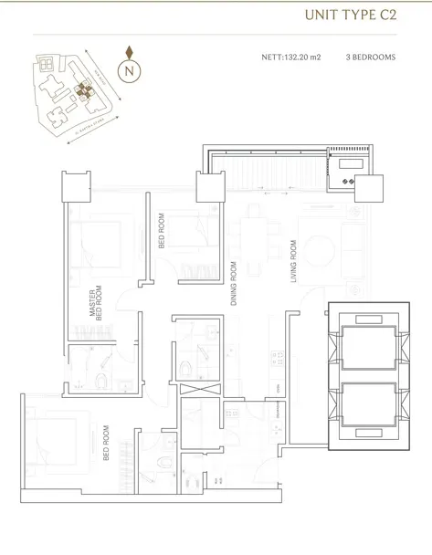 Unit Tipe C2 dengan net size 132.20 sqm yang terdiri dari 3 kamar tidur
