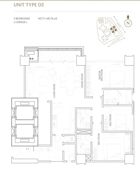 Unit Tipe D2 dengan net size 148.78 sqm yang terdiri dari 3 kamar tidur.