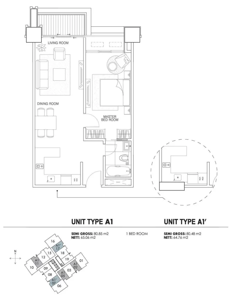 Unit Tipe A1 dengan net size 65.06 sqm yang terdiri dari 1 kamar tidur