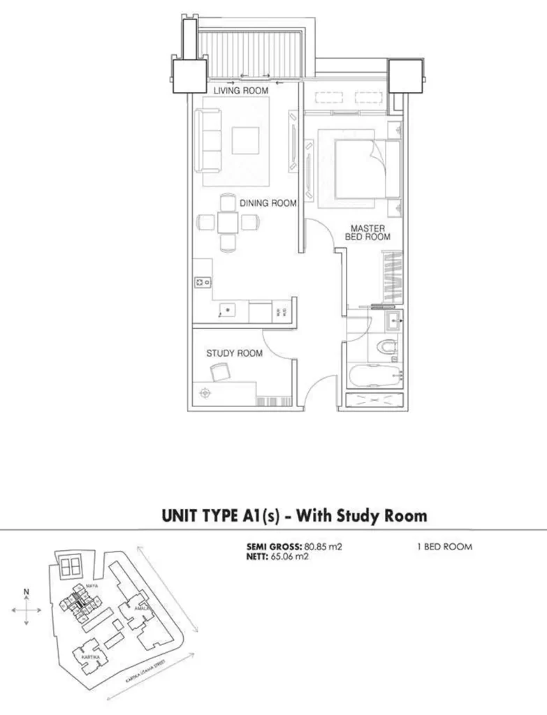 Unit Tipe A1s dengan net size 65.04 sqm dengan 1 kamar tidur + ruang belajar