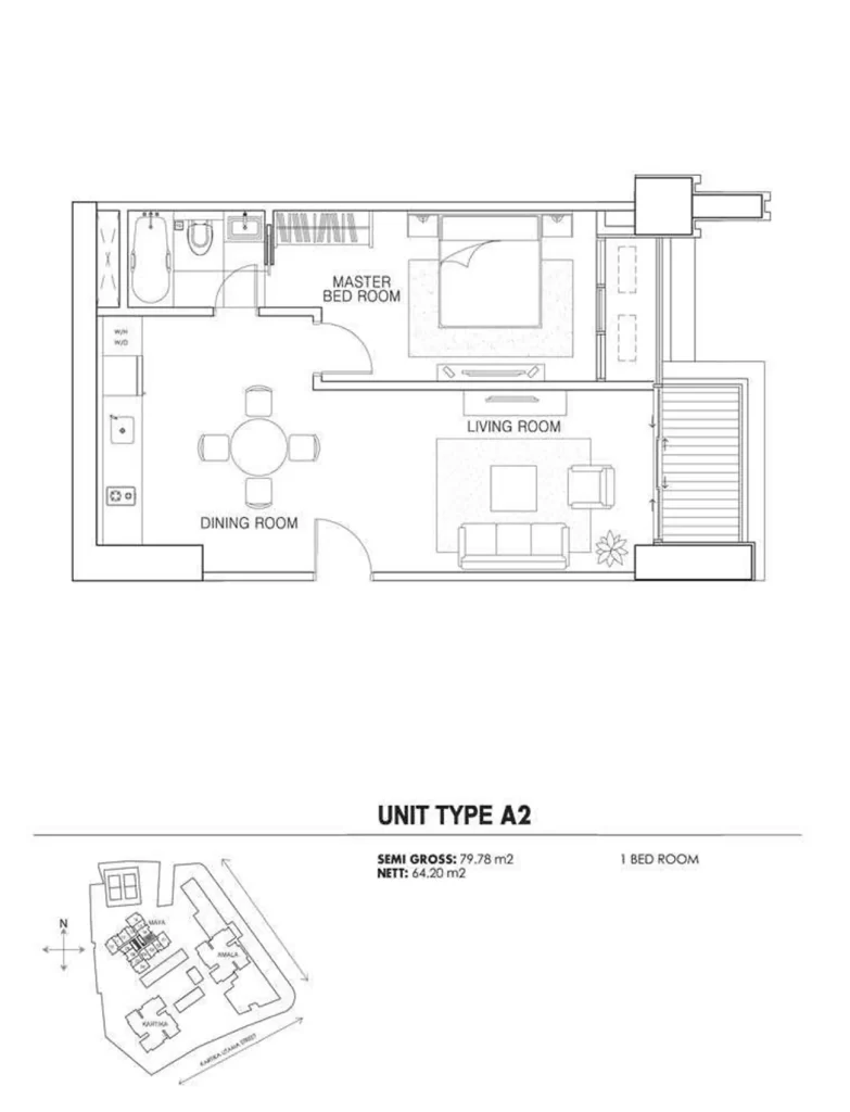 Unit Tipe A2 dengan net size 64.20 sqm dengan 1 kamar tidur