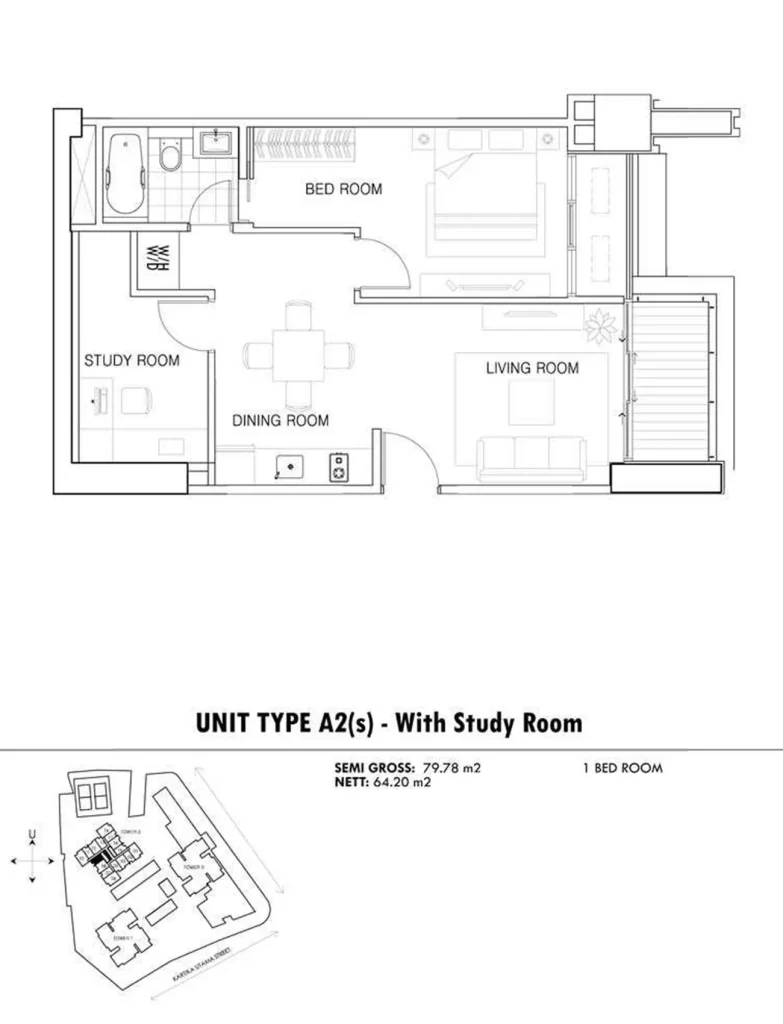 Unit Tipe A2s dengan net size 64.20 sqm dengan 1 kamar tidur + 1 ruang belajar