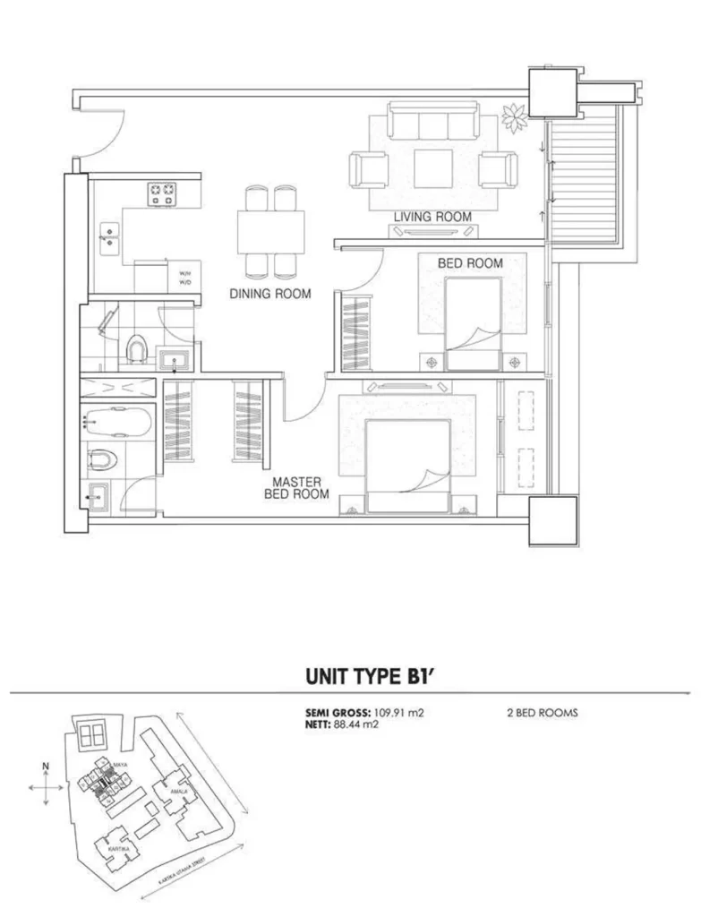 Unit Tipe B1’ dengan net size 88.04 sqm dengan 2 kamar tidur