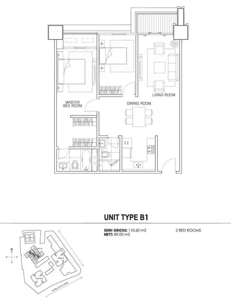 Unit tipe B1 dengan net size 89.00 sqm yang terdiri dari 2 kamar tidur