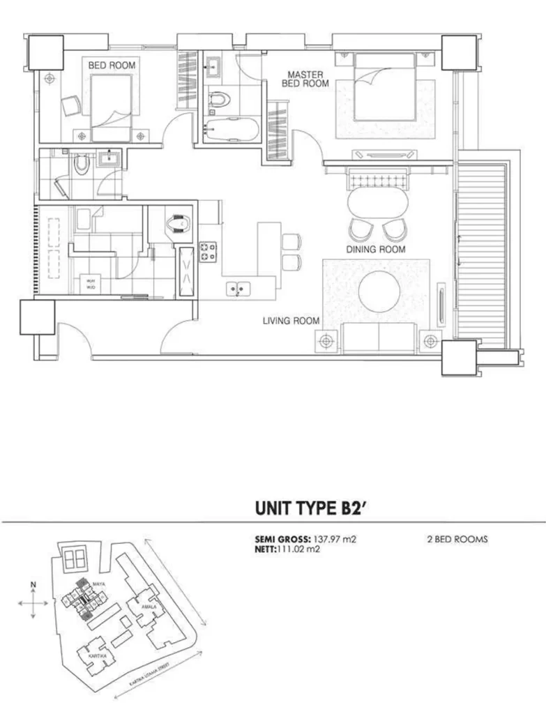 Unit Tipe B2’ dengan net size 111.00 sqm dengan 2 kamar tidur