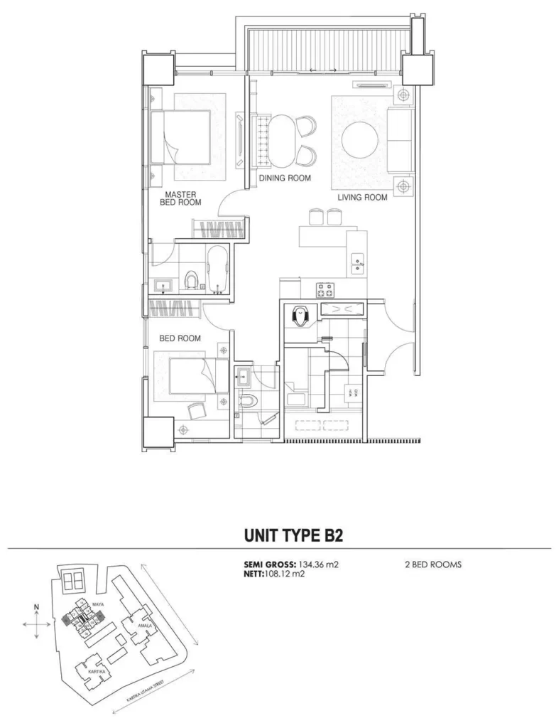 Unit Tipe B2 dengan net size 108.12 sqm yang terdiri dari 2 kamar tidur